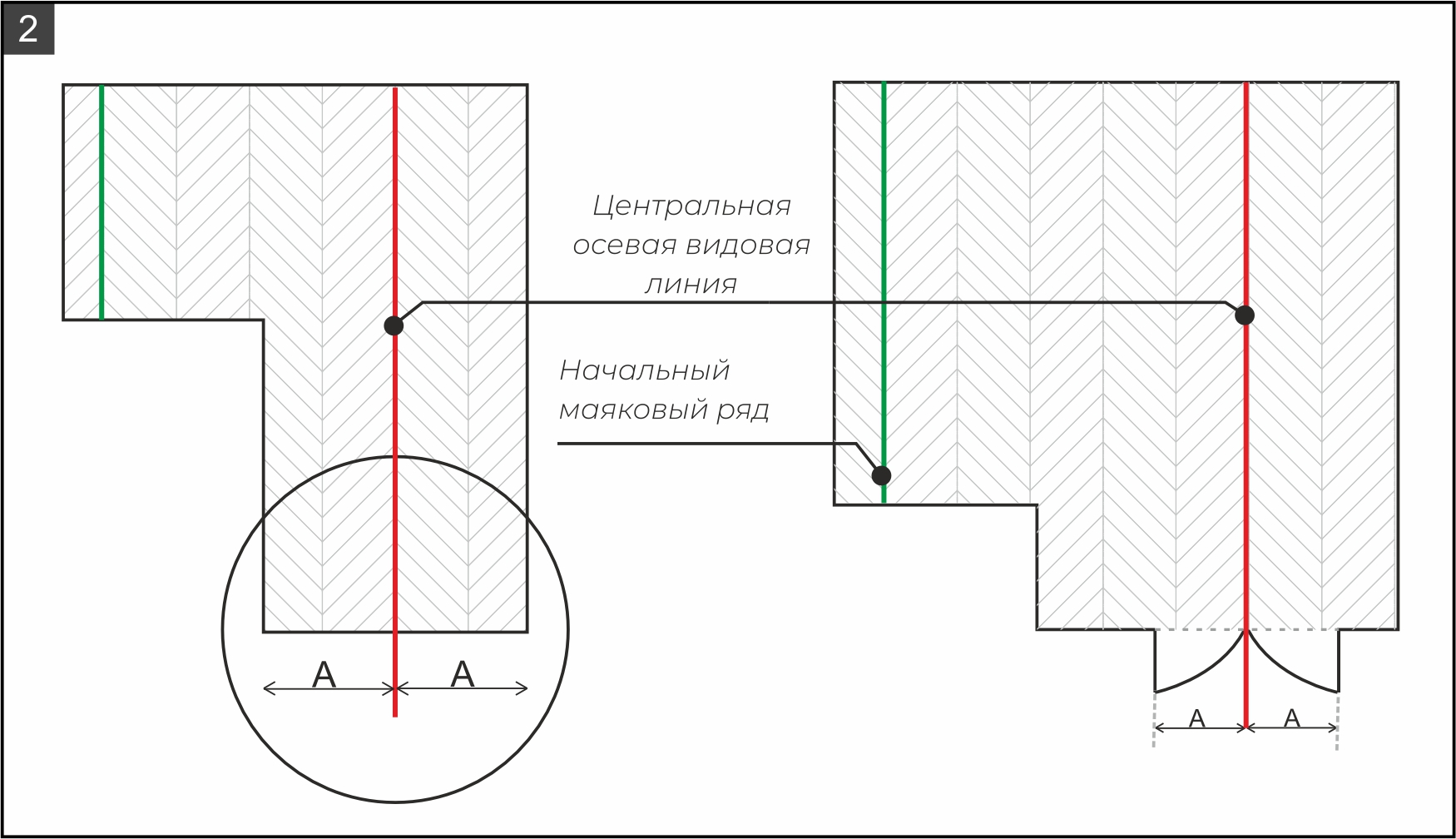 8.1. Перед укладкой проведите измерения помещений и разметочные работы: отметьте центральную осевую видовую линию. Чаще всего линию отмечают по центру длинного коридора или по центру дверного проема (рис. 2).